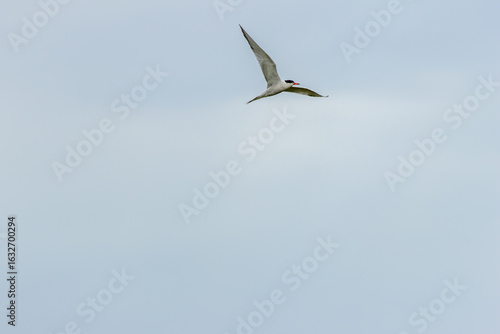 Obraz premium Common Tern (Sterna hirundo) in flight over Bull Island, Dublin – often found along coastal regions