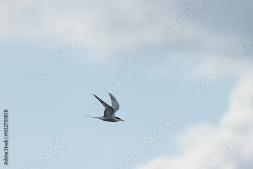 © fluffandshutter, Obraz premium Common Tern (Sterna hirundo) in flight over Bull Island, Dublin – often found along coastal regions