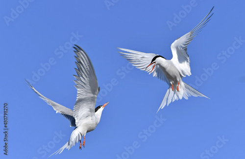 © Uryadnikov Sergey, Fototapeta premium Common Terns interacting in flight. Adult common terns in flight on the blue sky background. Scientific name: Sterna hirundo. Ladoga Lake. Russia.