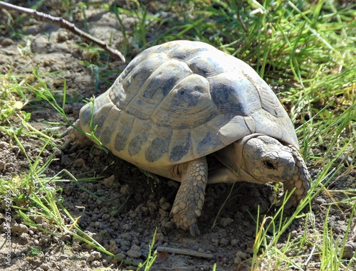 Fototapeta premium common turtle, mediterranean spur thighed tortoise in grass in natural...