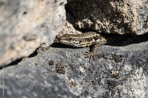 © Erik, Fototapeta premium Common Wall Lizard Peeking Out From Under Rock in Springtime