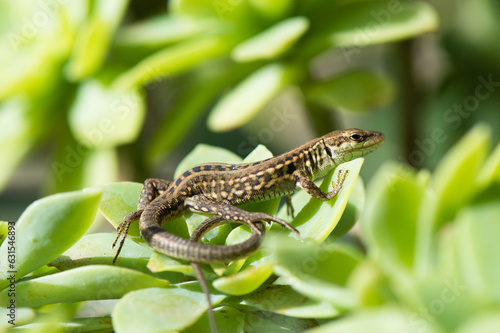 © amilat, Naklejka premium Common wall lizard, Podarcis muralis, sunbathes on the succulent leaves