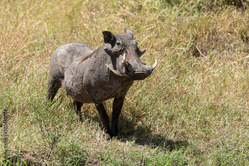 © Nick Dale, Fototapeta premium Common warthog stands eyeing camera in long grass