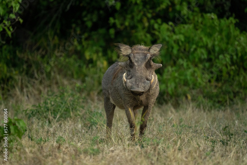 Fototapeta premium Common warthog stands watching camera near bushes