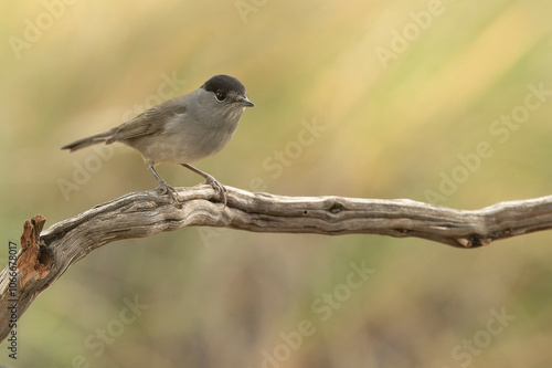 © Jesus, Obraz premium Common whitethroat in a Mediterranean pine and oak forest on a cloudy autumn day