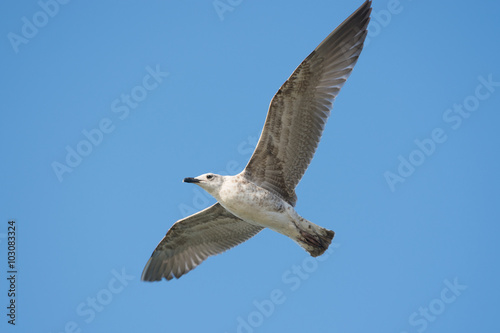 Obraz premium Common yellow-legged gull soars in the sky