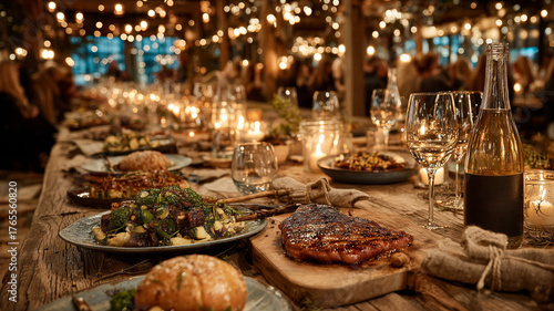 Fototapeta premium Communal dining experience with diverse group set in cozy ambiance
