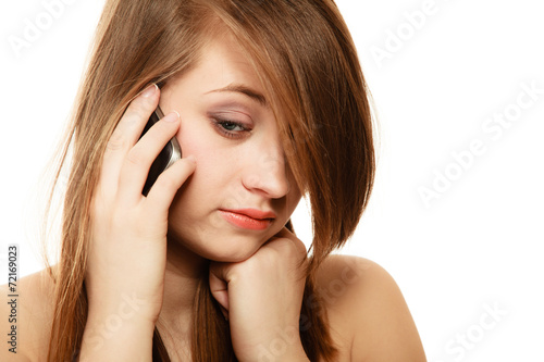 Fototapeta premium Communication. Sad girl talking on mobile phone