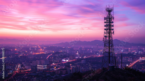 Fototapeta premium Communications tower on a hilltop overlooking a sprawling city during a vibrant sunset