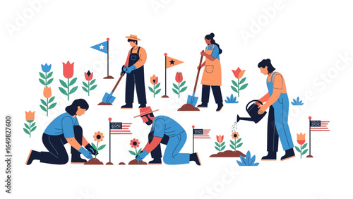Obraz premium Community Garden: A vibrant illustration depicts a group of diverse individuals working together in a flourishing community garden, each tending to their plot with care.