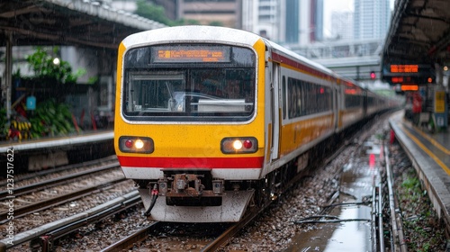© BROPRADANA, Naklejka premium Commuter train at city station on rainy day