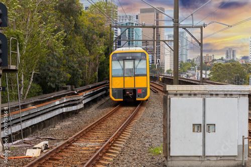 Naklejka premium Commuter Train fast moving through a Station in Sydney NSW Australia locomotive electric light rail
