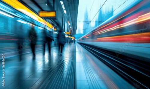 Fototapeta premium Commuters hurry as a speeding train blurs by at a modern station, capturing...