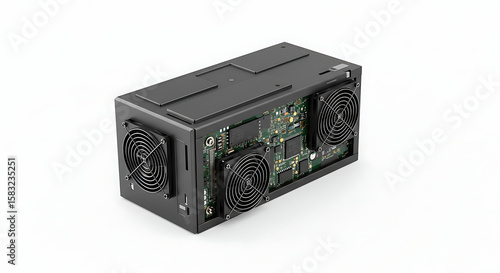 © Strother, Fototapeta premium Compact black electronic device with visible circuit boards and cooling fans, resembling a mini-server or computing unit, on a white background.