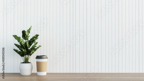 © Creator88, Fototapeta premium Compact container coffee shop exterior with white walls, wooden deck, and view of a serene valley