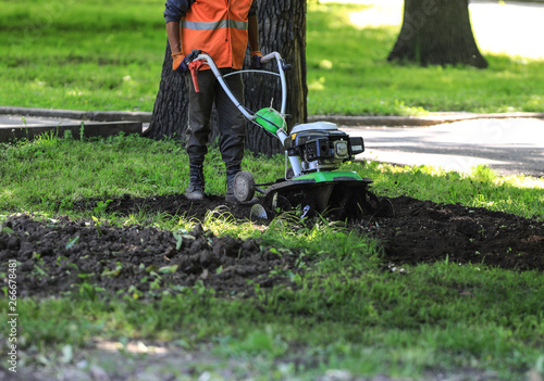Obraz premium compact earthmoving machine plowing the ground