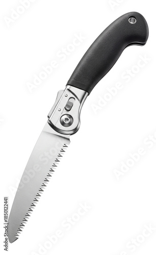 © OMD, Obraz premium Compact folding saw with a serrated blade and secure locking for outdoor use.