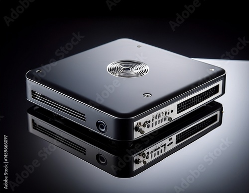 © Taylor, Fototapeta premium compact mini pc displayed on a sleek black background with universal connectivity options