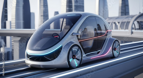 © Aleksandr_79, Obraz premium Compact pod car traveling on a transparent city bridge.