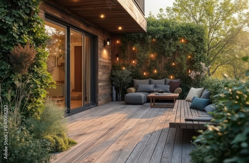 Fototapeta premium Compact veranda with vertical garden, wooden bench and cozy decor Generative AI