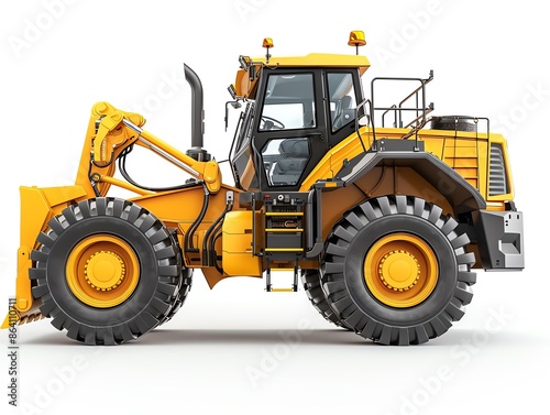 © nitiroj, Fototapeta premium Compact wheel loader with attachments, side view, isolated on white, showcasing industrial strength