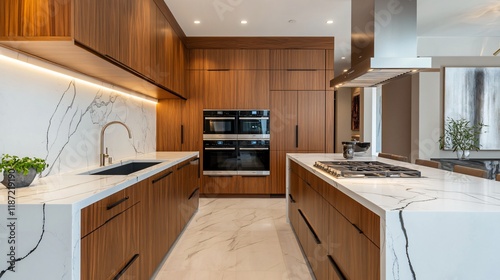 © hiiDeE, Fototapeta premium Compact yet functional kitchen with white cabinets, granite countertops, and modern appliances, copy space