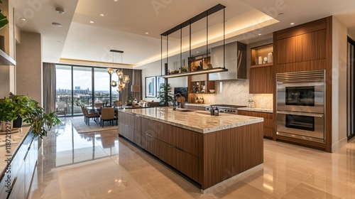 © hiiDeE, Fototapeta premium Compact yet functional kitchen with white cabinets, granite countertops, and modern appliances, copy space