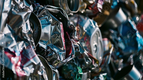 Fototapeta premium Compacting recycled metal cans, close-up, detailed crusher action, shiny surfaces