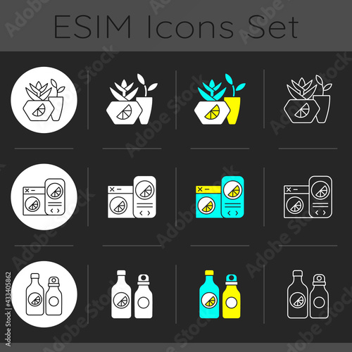 © IMG visuals icons, Fototapeta premium Company branding materials dark theme icons set. Branded eco office equipment. Specially designed clothes and accessories. Linear white, solid glyph and RGB color styles. Isolated vector illustrations