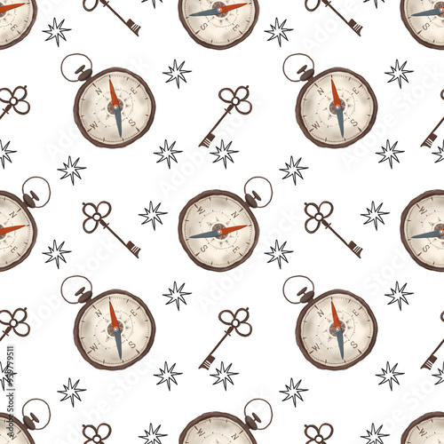 © Анна Султанова, Naklejka premium Compass and keys seamless pattern.