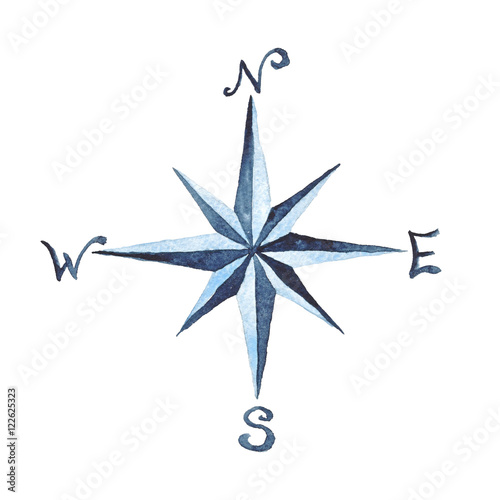 © Tanya Kart, Naklejka premium Compass Rose Nautical Watercolor Illustration Hand-painted Isolated Sea Element Navy Blue Ocean