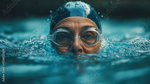 Fototapeta premium Competitive swimmer dives into clear water during a race with determined...