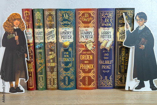 © kittyfly, Naklejka premium complete colorful collection paper books by JK Rowling about Harry Potter, appealing to book lovers, especially fans children's literature and fantasy, Frankfurt - December 22, 2023