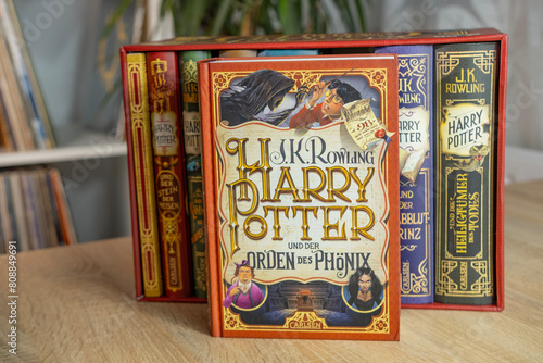 Naklejka premium complete colorful collection paper books by JK Rowling about Harry Potter, appealing to book lovers, especially fans children's literature and fantasy, Frankfurt - December 22, 2023