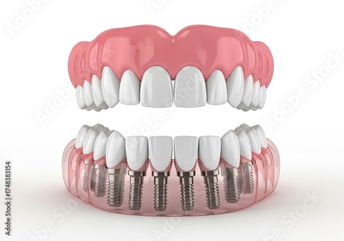 Obraz premium Complete Dental Prosthesis Model on White Background, Showing Implants and...