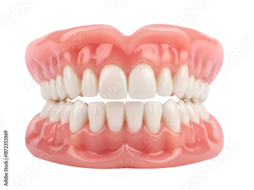 Obraz premium Complete Dentures: Upper and Lower Prosthetic Teeth and Gums On White Background