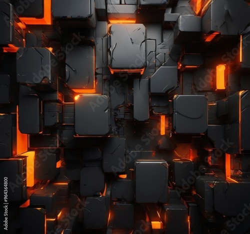 © Nipon, Obraz premium complex arrangement of black cubes, each with a unique shape and size, creating a visually striking and intricate pattern. The cubes are illuminated from within, casting a warm
