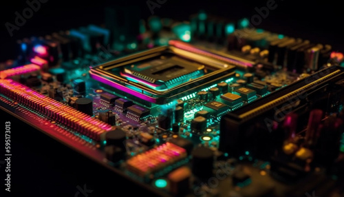 © Stockgiu, Obraz premium Complex circuit board shows intricate computer engineering generated by AI