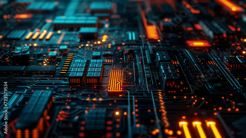 © RISHAD, Obraz premium Complex circuit board with glowing red paths.