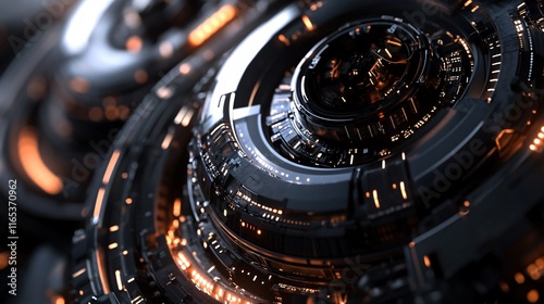 Fototapeta premium Complex circular mechanism with orange lights is spinning and glowing