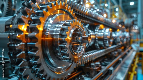 Fototapeta premium Complex cogwheel system, polished metallic surfaces gleaming, demonstrating...