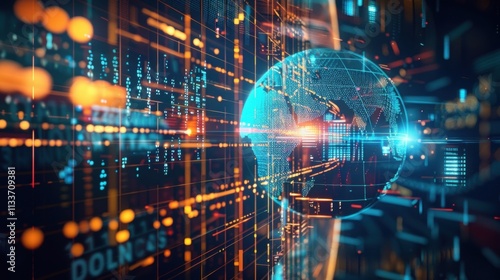 © Justlight, Obraz premium Complex data processing system managing global information streams, visualizing connections and data flow across continents with futuristic digital globe