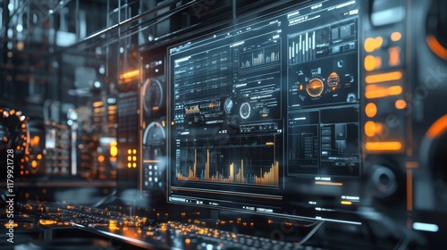 Obraz premium Complex digital interface displaying real time data and analytics for efficient management and automation in advanced manufacturing environment, enhancing productivity and optimizing workflows