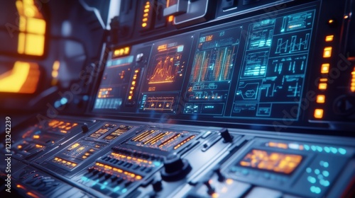 Obraz premium Complex digital interface featuring various charts, graphs, and data visualizations on multiple screens, highlighting advanced technological control in a spacecraft setting