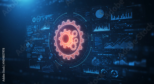 Obraz premium Complex digital interface with gears and data visualizations. Technology and engineering concepts for automation and process.