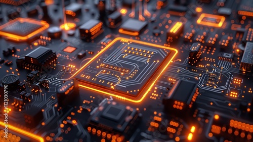 Obraz premium Complex electronic circuit board with glowing orange lights, representing the...