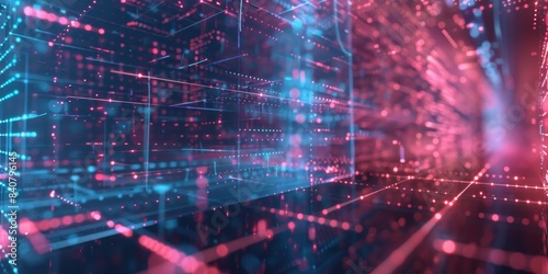 Fototapeta premium Complex geometric structures in a virtual, holographic background, highlighting the intersection of innovation and advanced technology