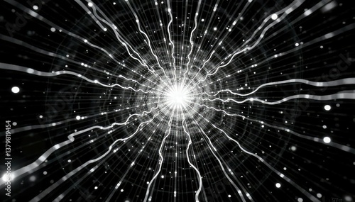 Naklejka premium Complex interwoven lines forming a starburst, monochrome, illusion, optical,...