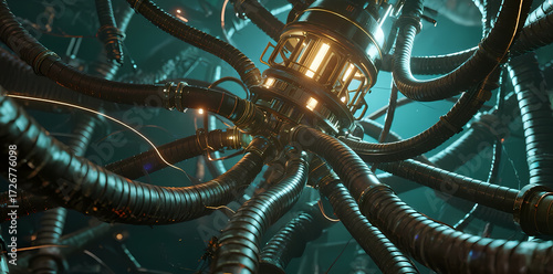 Fototapeta premium Complex mechanical structure with glowing central core and multiple articulated pipes in a dark industrial environment
