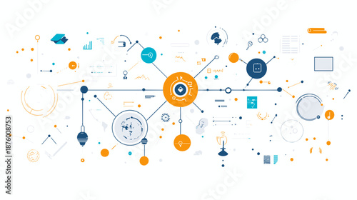 © maulan, Obraz premium Complex Network Diagram with Colored Nodes.
